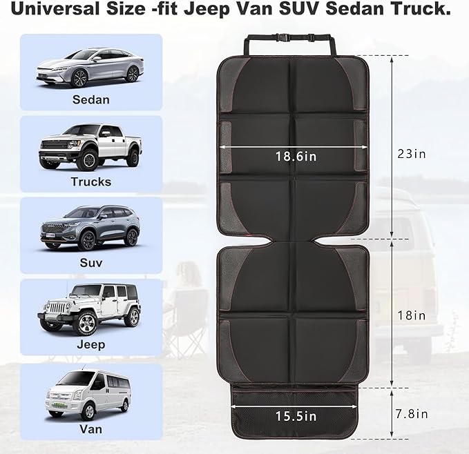 - The whole dimension of the auto seat protector carseat is 18.6 x 48.8 inch, the seat: 18 x 18.6 inch, the back: 23 x 18.6 inch, and the mesh pocket: 15.5 x 7.8 inch. Universal fit Jeep Van SUV Truck