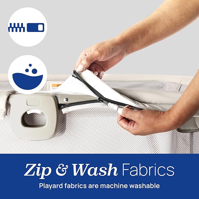 - ZIP-OFF FABRICS – Mattress cover and frame fabrics on the playpen are removeable and machine washable for easy cleaning.