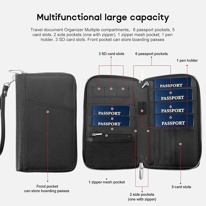 - 3.Travel document Organizer Multiple compartments,6 passport pockets, 5 card slots, 2 side pockets (one with zipper), 1 zipper mesh pocket, 1 pen holder, 3 SD card slots. Front pocket can store boarding passes