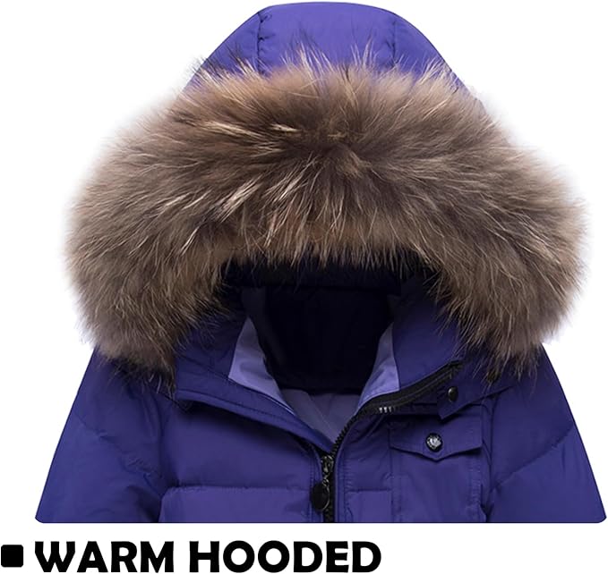 - Excellent design: Baby snowsuit snow pants jacket use classic ski wear design, cute big hood and fur collar can provide continuous warmth for baby's ears and head, adjustable suspenders with warm pants legs to allow baby to better activity.