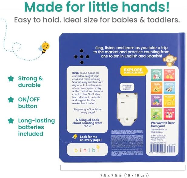 - ๐๐๐ฟ๐ฎ๐ฏ๐น๐ฒ & ๐ ๐ฎ๐ฑ๐ฒ ๐๐ผ๐ฟ ๐๐ถ๐๐๐น๐ฒ ๐๐ฎ๐ป๐ฑ๐. Binibi bilingual English-Spanish books for babies & toddlers 1-3 are durable and feature hard covers, thick pages and rounded corners - they are made for little hands and are easy to clean! All Spanish musical sound books feature an on/off button for extended battery life, and easily replaceable batteries. 3 AG10 batteries in every book.