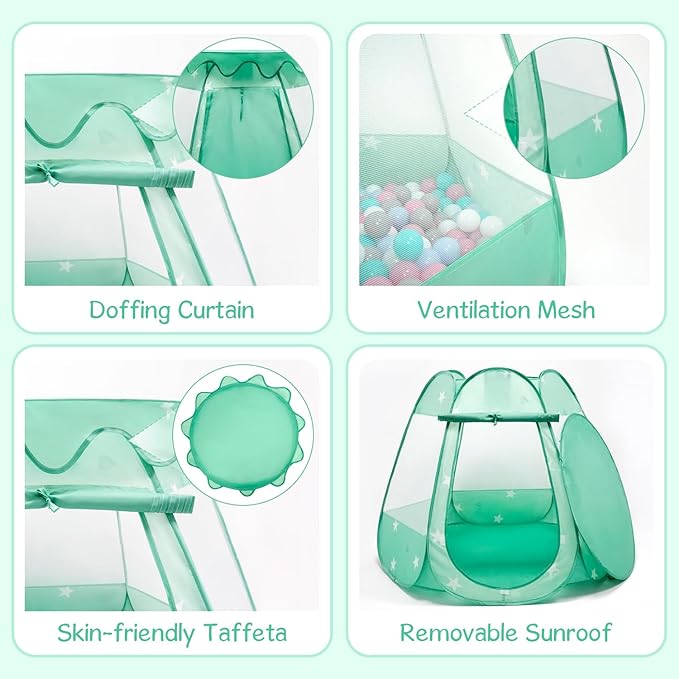 - [50 Balls Included]: This kids play tent comes with 50 bright colored balls. Our toys for 1 2 3 year old girl has passed strict product tests and USA Toy Safety Guidelines. This 1 year old girl gift is a dreamlike playhouse, The ball pit tent features LED star string light, mesh windows, removable sunroof, crawling door with roller curtain, and anti-scratch-designed velcro. Which is very for kids' use and improves children's imagination, creativity, practical ability.