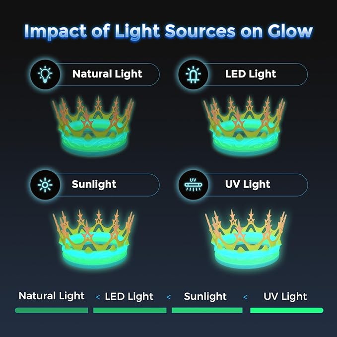 - Exceptional Glow Effect - This glow-in-the-dark PLA absorbs light and emits a soft glow in the dark. The brightness lasts for up to 5-100 minutes, with a 310% enhancement in brightness compared to standard glow-in-the-dark materials, providing a brighter and longer-lasting glow.