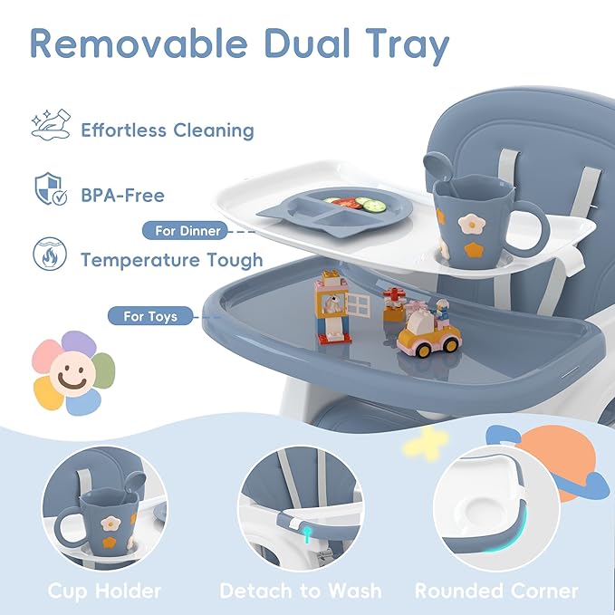 - 🍼 REMOVABLE DUAL TRAY - The baby feeding chair includes a removable double tray, perfect for meals and playtime. The top tray features a built-in cup holder, while the bottom tray provides a spacious play surface. Made from BPA-free PP material, these trays are safe for your child and easy to clean.
