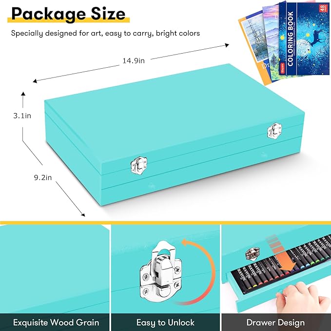 - đ¨ăHigh Quality, Deluxe Art KităThe Deluxe art case has everything you need to get started creating in a compact wooden case! You can begin drawing, coloring and painting as soon as you open the box. Specially designed with 2 big sketchbooks, 1 coloring book, 1 Gift Box. Great art set for any level of artist. This art case makes a great Gift for adults and kids, girls and boys, they are going to have so much fun!