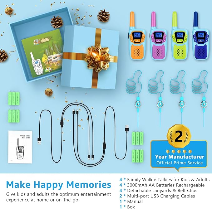 - Included Components : 1 * Manual & 3 Year Manufacturer Service, 2 * Multi-port USB Charging Cables, 4 * 3000mAh AA Batteries Rechargeable, 4 * Adjustable Safety Lanyards & Belt Clips, 4 * Family Walkie Talkies for Kids & Adults 1 * Manual & 3 Year Manufacturer Service, 2 * Multi-port USB Charging Cables, 4 * 3000mAh AA Batteries Rechargeable, 4 * Adjustable Safety Lanyards & Belt Clips, 4 * Family Walkie Talkies for Kids & Adults