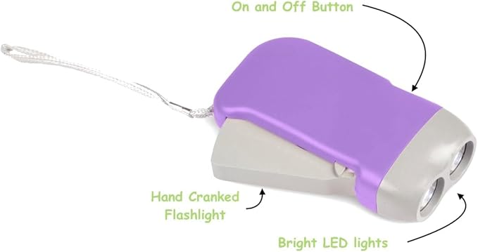 - š¦FLASHLIGHT - with bright LED lights. Simple hand cranked function recharges in-built batteries so no additional batteries or charging required, the compact size and wrist strap make it perfect for camping, sleepovers and backyard nighttime adventures.