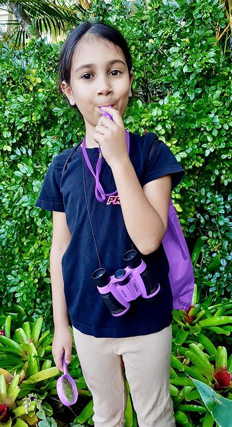 - šLARGE MAGNIFYING GLASS - 3 x magnification for examining plants, insects and rocks. Wonderfully fun for camping trips and outdoor or indoor investigations. SAFE Non Choking pealess FOX WHISTLE - great for hiking, scouting, sports, games and safety locator. Clip on thick lanyard to be worn around the neck for quick access for signaling location or emergency use.