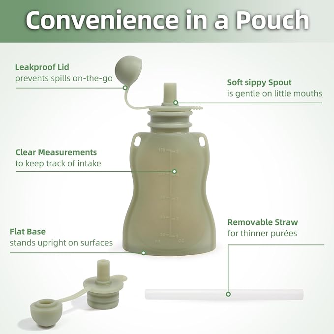 - Independent Feeding: These reusable pouches for toddlers each come with a removable straw, which allows baby to eat safely at their own pace and prevents squeezing and spilling. The lid is attached to the spout so you don't have to worry about mess or loss, and the bottle has a leak-proof design that won't cause a messy meal.