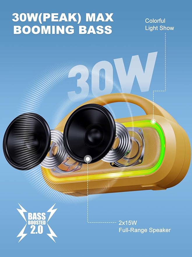 TPone Portable Bluetooth Speaker, 30W (Peak) Wireless Speaker for Outdoor, Up to 12H Playtime, IPX5 Waterproof with Light, TWS Pairing, for Home/Party/Outdoor/Beach, Birthday Gift (Peach Fuzz)