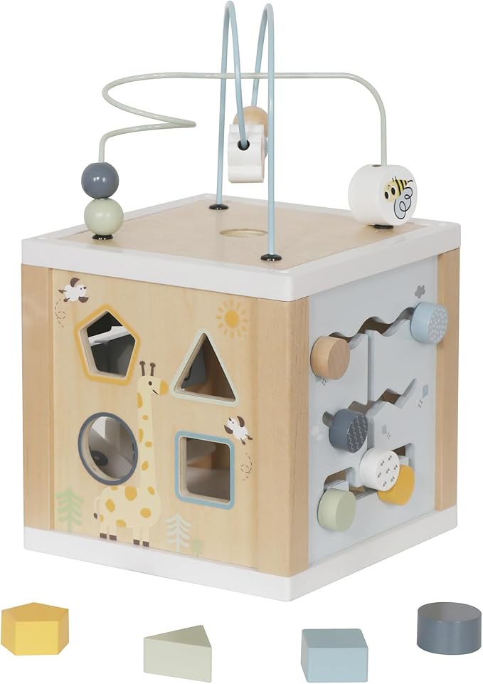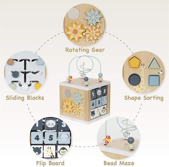 - đăMultifunction Fun Activity CenterăCombines 5 different activities in activity toddler cube:wooden bead mazes, baby shape sorter, flip board, spinning gears, sliding track. The montessori toys is best gifts kids play table toys for boys girls when birthday party, or christmas.