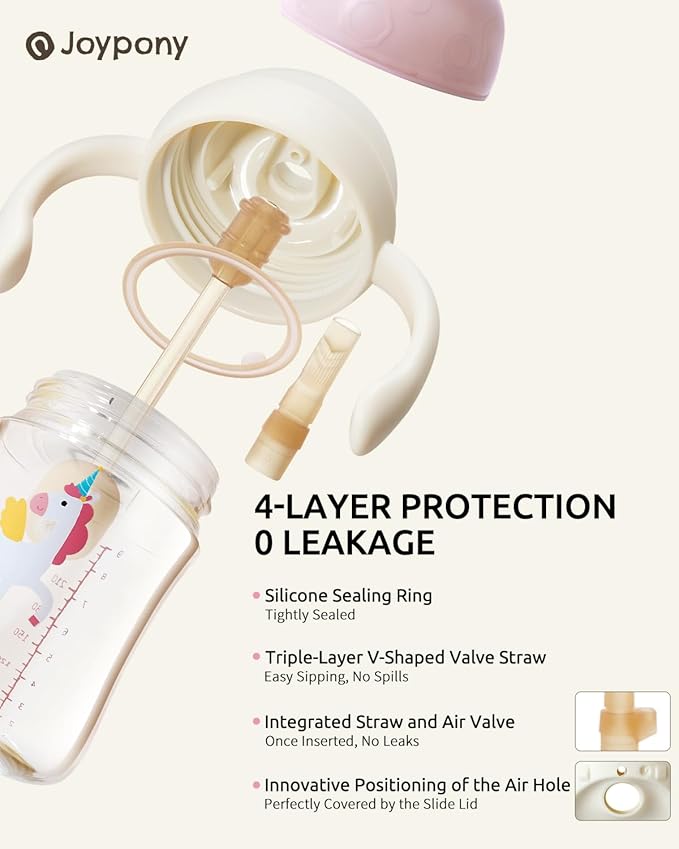 - 【Simple to Use & Clean】Joypony toddler cup is designed for effortless use, featuring easy assembly, disassembly, and cleaning. The wide neck and less parts make it clean easily, simplifying your cleaning routine while promoting your baby's independence and coordination