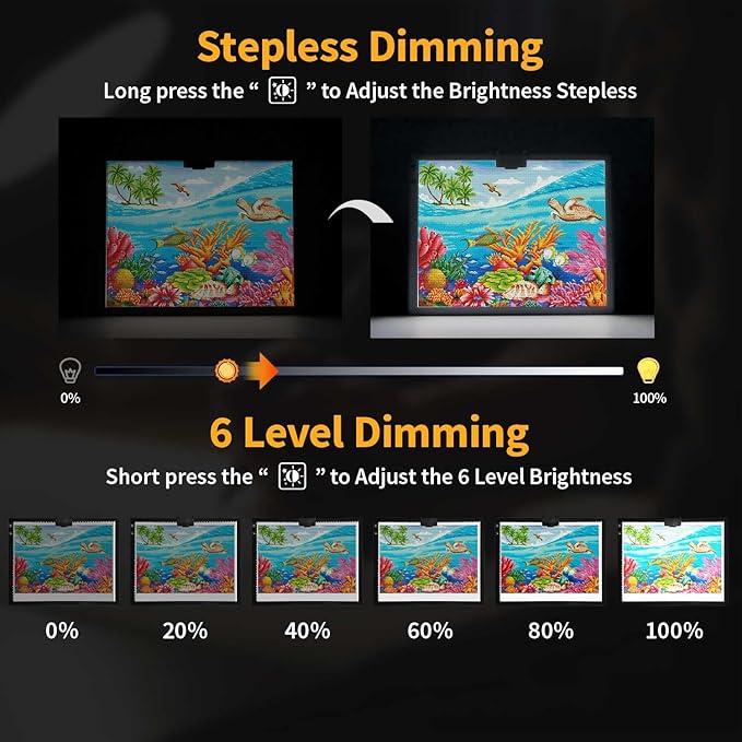 - 【Three Color Temperature Stepless Dimming】 The A3 light box can achieve 0-100% brightness control and has a memory function. press the button to turn ON/OFF the light board and change the lighting mode to white, warm yellow, or warm white. Each color mode has 6 brightness dimming options,long pressing the touch button can change the brightness steplessly. 6500K, bright enough, even light, not glaring, adaptable to art works in different environments, no longer eye fatigue when painting.