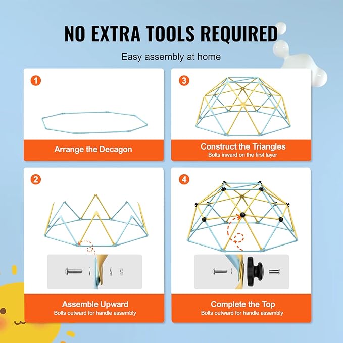 - Easy Setup: Everything you need is included, from installation tools to detailed manuals and video guides. Our clear instructions will effortlessly guide you through assembly, allowing you to quickly create a fun playground for your children with our kids climbing dome.