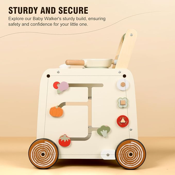 - STURDY AND SECURE DESIGN: Made from durable wood with anti-slip rubber wheels, this wooden baby walker provides a stable and secure platform for your child's early exploration.