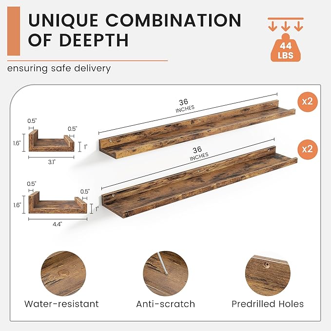 - 【Picture Ledge Perfect for Display】FLYJOE picture ledge shelves for wall turn your walls into a stunning photo gallery! These spacious shelves are ideal for showcasing a variety of picture frames in one secure place. With a thoughtful protective lip, you can display everything from photos to collectibles without worrying about them falling off