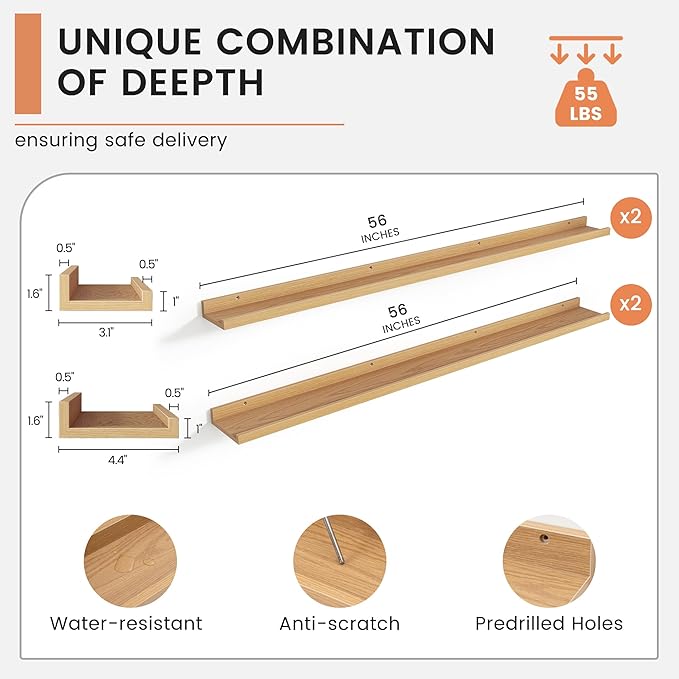 • 【Picture Ledge Perfect for Display】FLYJOE picture ledge shelves for wall turn your walls into a stunning photo gallery! These spacious shelves are ideal for showcasing a variety of picture frames in one secure place. With a thoughtful protective lip, you can display everything from photos to collectibles without worrying about them falling off