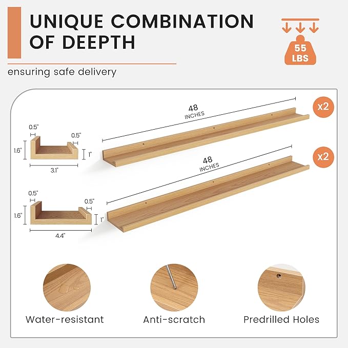 • 【Picture Ledge Perfect for Display】FLYJOE picture ledge shelves for wall turn your walls into a stunning photo gallery! These spacious shelves are ideal for showcasing a variety of picture frames in one secure place. With a thoughtful protective lip, you can display everything from photos to collectibles without worrying about them falling off