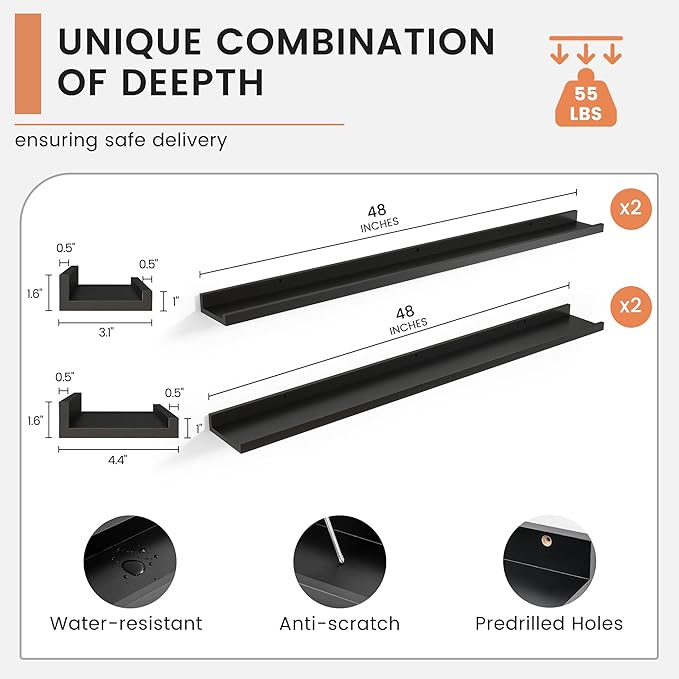 - 【Picture Ledge Perfect for Display】FLYJOE picture ledge shelves for wall turn your walls into a stunning photo gallery! These spacious shelves are ideal for showcasing a variety of picture frames in one secure place. With a thoughtful protective lip, you can display everything from photos to collectibles without worrying about them falling off