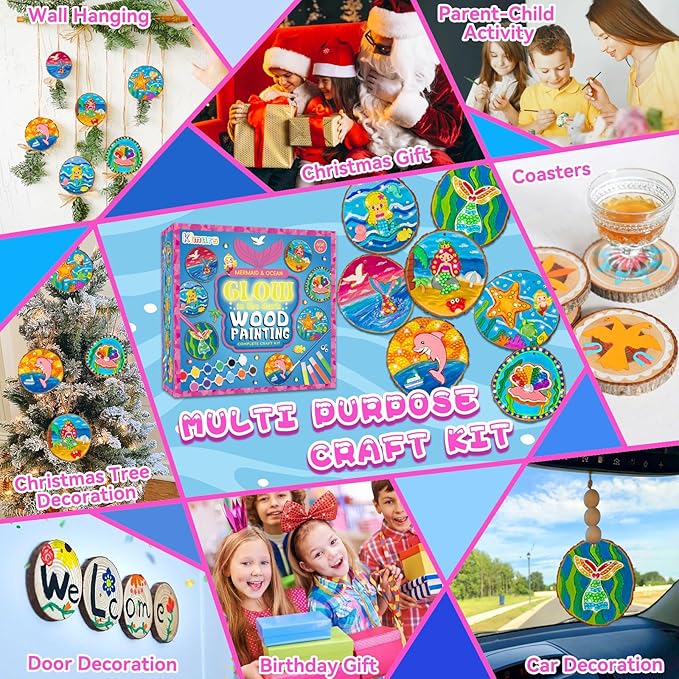 - 【Creative kids Activities】:Unleash the magic of creativity with Klmars Glow-in-the-Dark Wood Painting Kit! Designed for mermaid lovers, girls, and kids age 6-12, this enchanting craft kit is the perfect parent-child activity that combines fun and imagination.