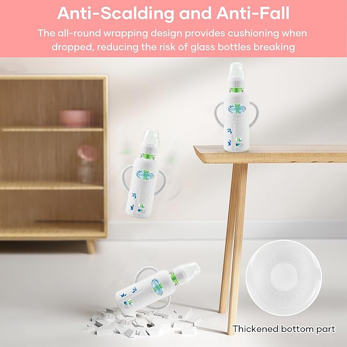 - 【Excellent Protection】- Our bottle sleeves use a full-surface silicone wrap design. Even if accidentally dropped, it can protect the bottle from being scratched or even broken. This is a necessary maternal and child supplies for families who are used to using glass bottles, and there is no need to worry about the bottle always being damaged and broken.