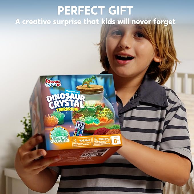 Klever Kits Make Your Own Dinosaur Crystal Terrarium Crafts Kit for Kids-Crystal Growing Science 12 Color LED Night Light Birthday Gifts Toys for Kids