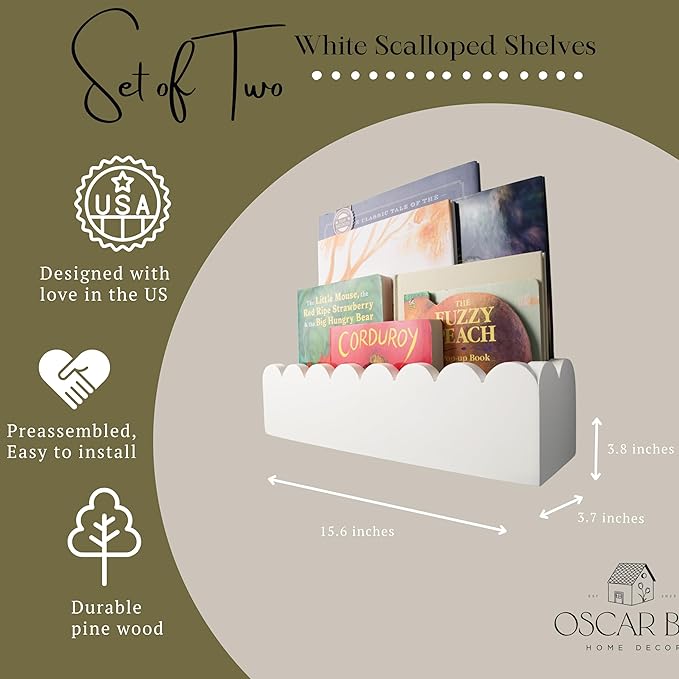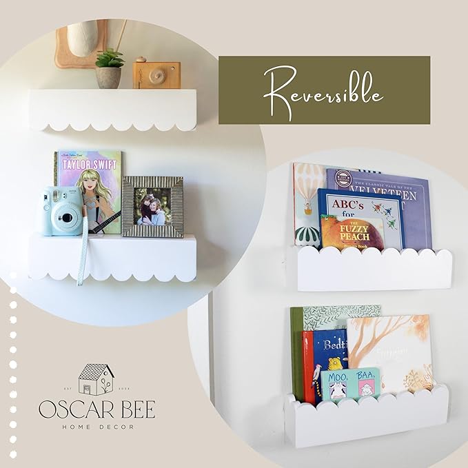 - ๐๐๐๐๐ผ๐บ๐ถ๐๐ฒ ๐๐ผ ๐ฌ๐ผ๐๐ฟ ๐ก๐๐ฟ๐๐ฒ๐ฟ๐: Featuring a reversible scalloped design, this kids wall bookshelf fits perfectly in baby rooms, whether as traditional nursery shelves for wall or floating book shelves for wall nursery. Easily customize for girls room shelves, nursery bookshelf wall, or shelves for nursery girl or boy themes