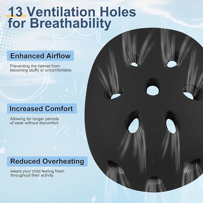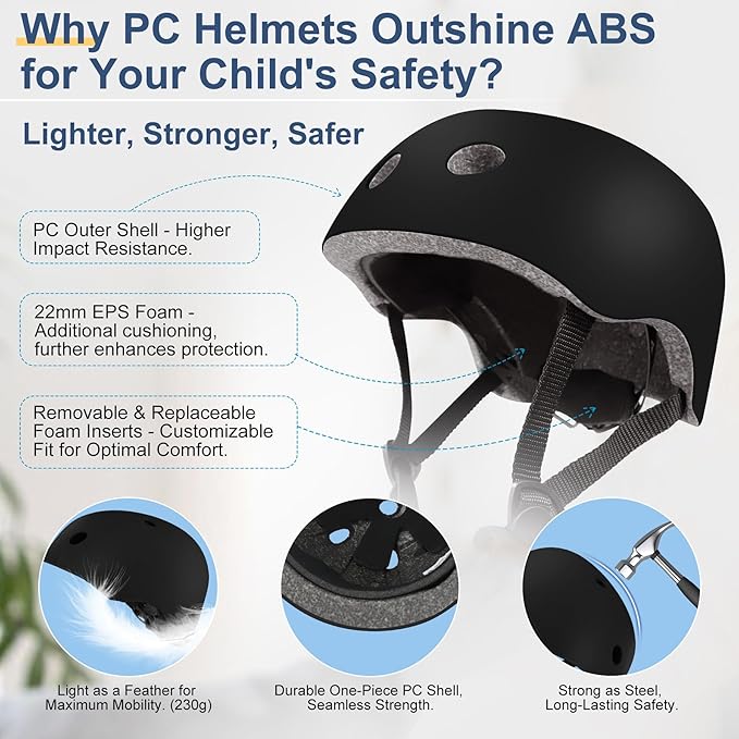 - Superior Safety PC Shell: Vvinca bike helmet is crafted from a lightweight, in-mold PC shell with an EPS foam middle layer, providing a safer and more durable alternative to ABS helmets. The one-piece design ensures it won't delaminate or crack, making it perfect for children. With 13 ventilation holes, the helmet stays cool and comfortable, even during extended wear