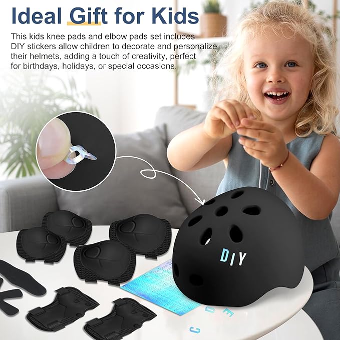 - 9 in 1 Protective Gear with DIY Stickers: This bike helmet set includes a black helmet, wrist guards, elbow pads, knee pads, DIY stickers, and a removable & washable liners foam liner, offering comprehensive protection for various activities like biking, skateboarding, and scootering. With included DIY stickers, kids can personalize their helmet