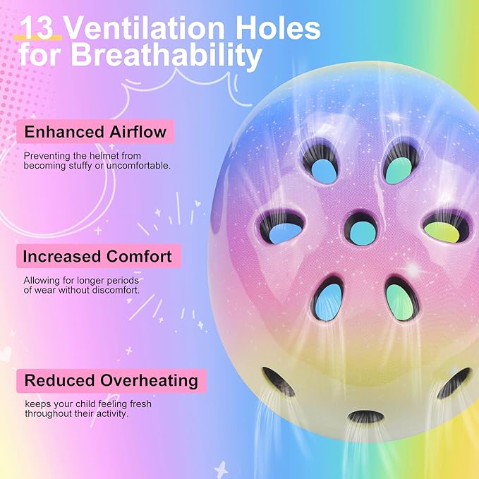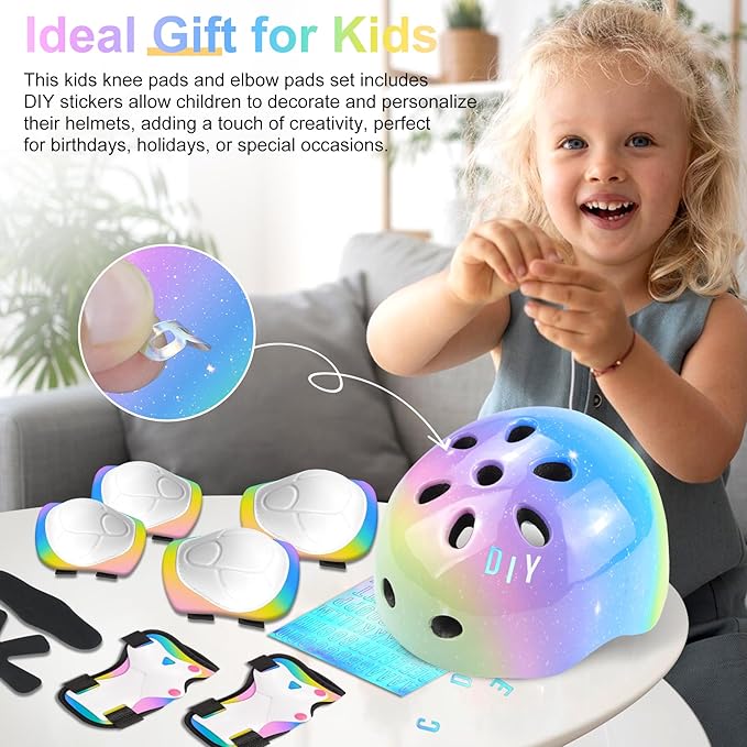 - 9 in 1 Protective Gear with DIY Stickers: This bike helmet set includes a color gradient helmet, wrist guards, elbow pads, knee pads, DIY stickers, and a removable & washable liners foam liner, offering comprehensive protection for various activities like biking, skateboarding, and scootering. With included DIY stickers, kids can personalize their helmet