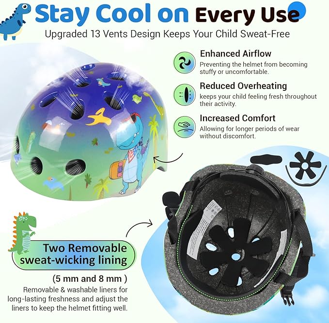 - Advanced Ventilation with a Snug Fit: The bike helmet kids 5-8 features a 13-vent design, 2 more than typical 11-vent ABS helmets, and keeps your child's head cool during sports. It includes two sets of removable, washable pads (5mm and 8mm) to fit different head shapes. Our kids bike helmets ages 5-8 offer easy adjustments with straps and a dial for a secure fit. A thick chin pad ensures extra comfort, while the quick-release buckle with padding allows for easy on/off without pinching.