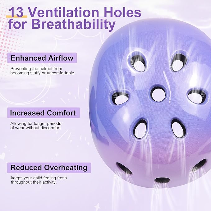 - Superior Safety PC Shell: Vvinca Color Gradient bike helmet is crafted from a lightweight, in-mold PC shell with an EPS foam middle layer, providing a safer and more durable alternative to ABS helmets. The one-piece design ensures it won't delaminate or crack, making it perfect for children. With 13 ventilation holes, the helmet stays cool and comfortable, even during extended wear