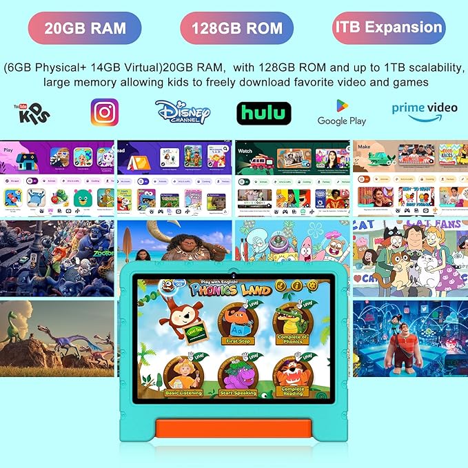 - 【20GB (6+14) RAM and 128GB Super ROM & 6000mAh Large Capacity Battery】 20GB ( 6GB Original + 14GB Expanded Virtual ) RAM + 128GB ROM (SD card expandable up to 1TB), it is able to run various apps compatibly and smoothly, and store your child's favorite movies, photos and apps, such as Kindle,Instagram,Disney+ and other daily required apps directly from the pre-installed play store to meet your child's diverse learning and entertainment needs. Let kids enjoy math, language, music, painting in the game. Equipped with a large 6000mAh battery, giving your child a stable and continuous use experience.