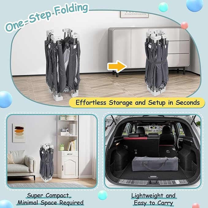 - Compact and Portable: Designed with on-the-go families in mind, this collapsible play yard folds easily and fits into the included carry bag, making it perfect for travel. Whether you’re heading to the park or visiting family, your baby will always have a secure, familiar place to play.