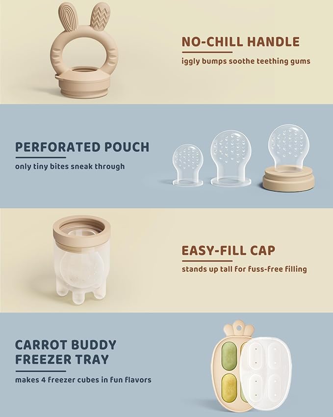 - 【Multi-size replaceable silicone nipple pouches】The combo food feeder provides 2 different sizes of pouches that serve your babies from 4 to 12 months. The nice shaped pouches are easy to chew and help comfort baby sore gums.