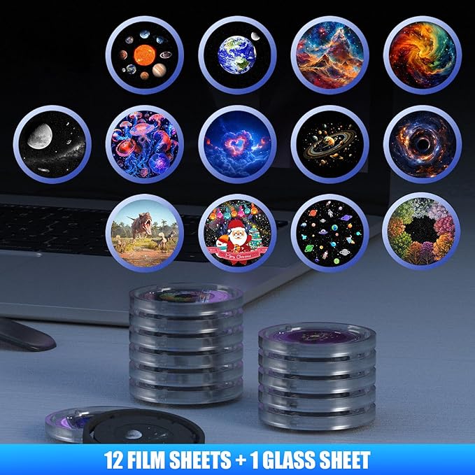 - Dynamic Meteor Starry Night Projection: Experience a breathtaking meteor shower right in your bedroom with dynamic meteor effects. The projector comes with 12 film slides and 1 glass slide, offering 17 vibrant light effects that transform your ceiling and walls into a mesmerizing starry sky