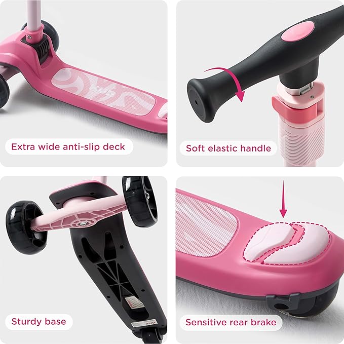 - 【Sturdy and safe design】: A three-wheel scooter is a stable than a two-wheel scooter, suitable for the first step learner. Anti-slip deck and Highly sensitive rear brake stops when stepped, ensure the safety of children's riding, solid bottom plate, maximum load-bearing 110 pounds, scooters for kids 3-12.