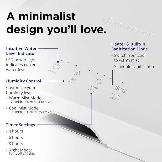 - HEALTHIER AIR WITH WARM OR COOL MIST: Experience cleaner, more breathable air with Carepod humidifier's ultrasonic mist technology. Choose between warm or cool mist to alleviate dry skin, improve sleep, and enhance your wellness in rooms up to 700 sq. ft.