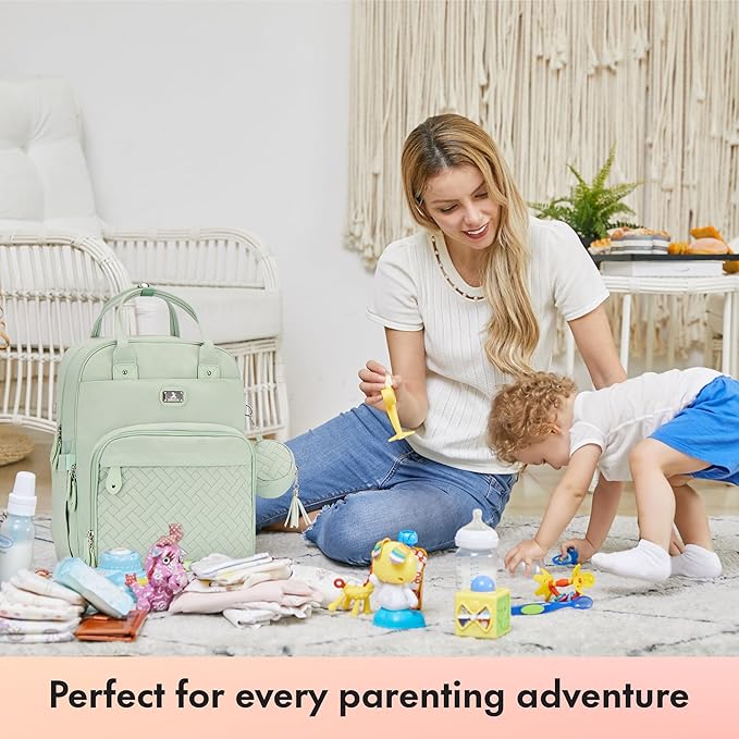 Dikaslon Diaper Bag Backpack with Portable Changing Pad, Pacifier Case and Stroller Straps, Large Unisex Baby Bags for Boys Girls, Multipurpose Travel Back Pack for Moms Dads, Mint Green