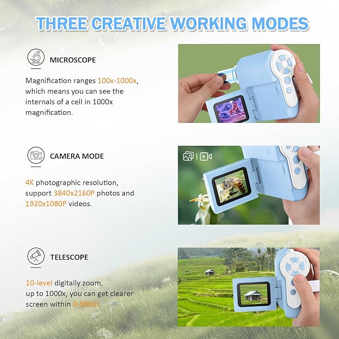 - ๐ฏ-๐๐ป-๐ญ ๐๐ฒ๐๐ถ๐ด๐ป: 1) Microscope Searching, 2) One-Click Photo & Video Recording, 3) Telescope, choose what you want to enhance child's learning experience. And this digital microscope made of 4K resolution, provides much higher clarity