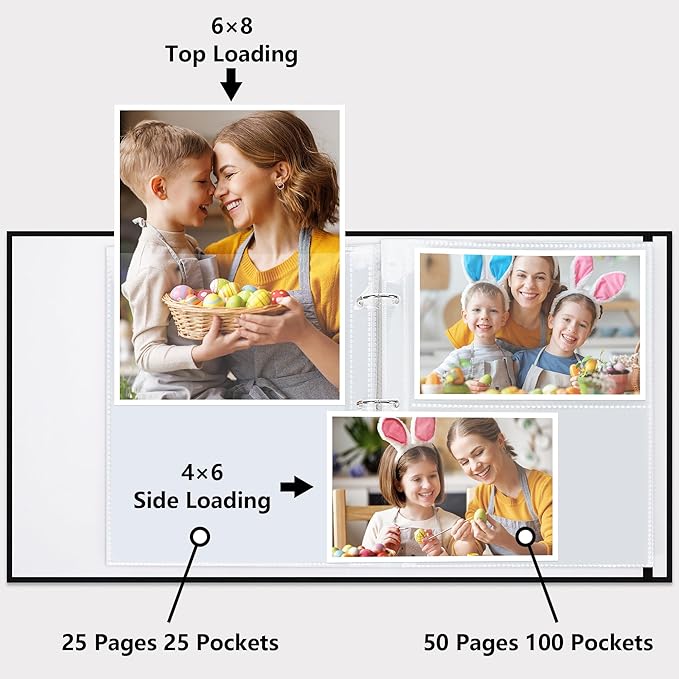 - Mixed Photo Size Storage: The family photo album measures 9.84”L x 8.86”W x 2.36”H. It includes 50 sheets (100 pockets) for 4x6 photos and 25 sheets (25 pockets) for 6x8 photos, allowing storage for up to 250 photos, with each pocket holding two