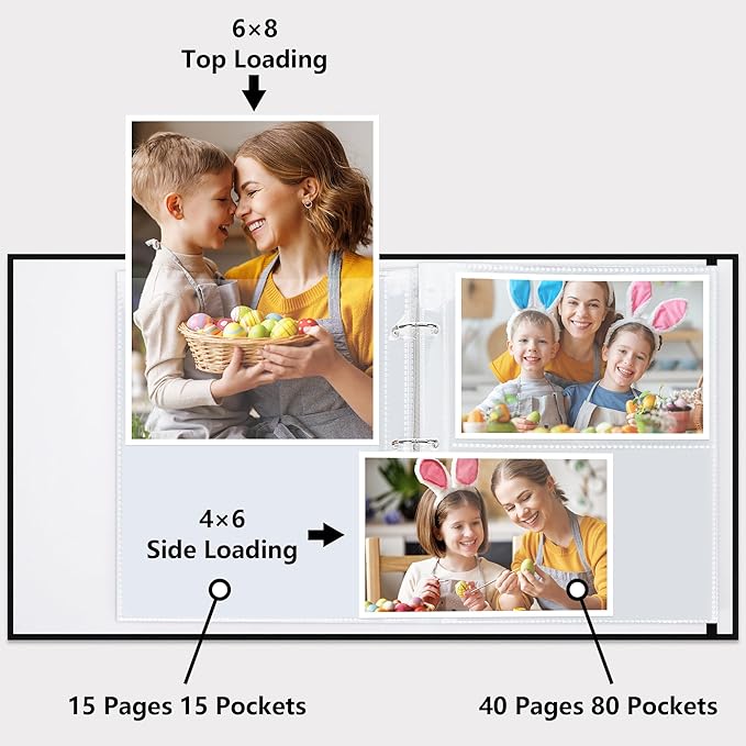 - Mixed Photo Size Storage: The family photo album measures 9.84”L x 8.86”W x 1.97”H. It includes 40 sheets (80 pockets) for 4x6 photos and 15 sheets (15 pockets) for 6x8 photos, allowing storage for up to 190 photos, with each pocket holding two