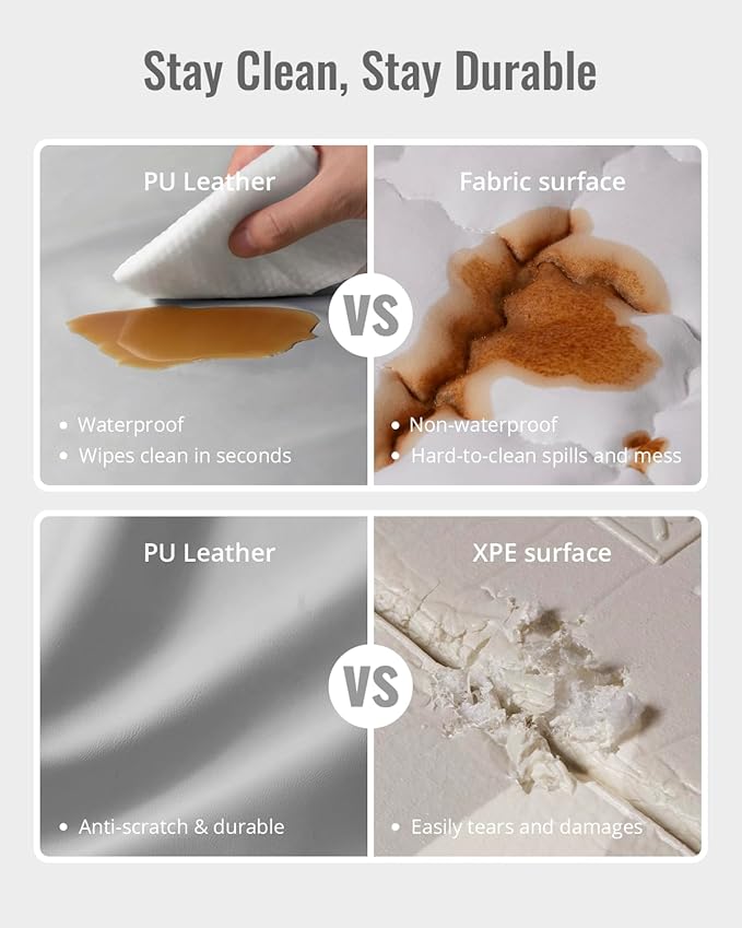 - Waterproof & Easy to Clean: Unlike many other mats that absorb spills, this Vegan leather baby play mat is 100% waterproof, making it effortless to clean. Just wipe it down with a damp cloth to remove food, milk spills, or any other mess, keeping your baby's play area spotless and hygienic