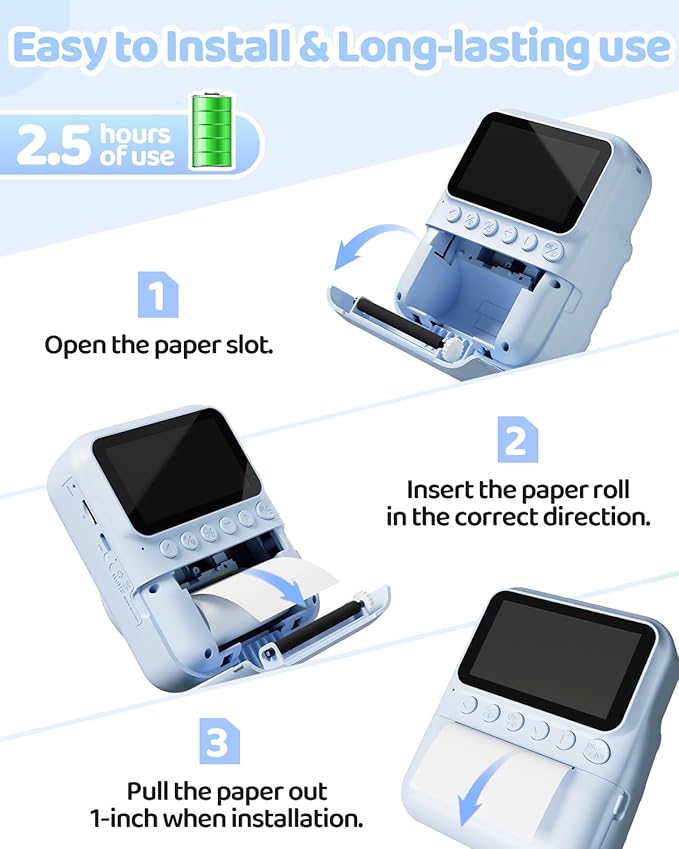 - LONG BATTERY LIFE: Our instant print camera for kids has a built-in 1000mAh battery that supports up to 4 hours of shooting on a single charge. Also, the digital toddler camera has a built-in 32GB memory card for storing tons of photos and videos.