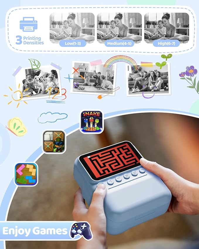 - MULTI-FUNCTIONAL INSTANT CAMERA: Our kids print camera has various functions such as photography, video, black and white printing, fun frames, music, games, flashlight and more. It can meet the different needs of children's entertainment and bring happiness to children.