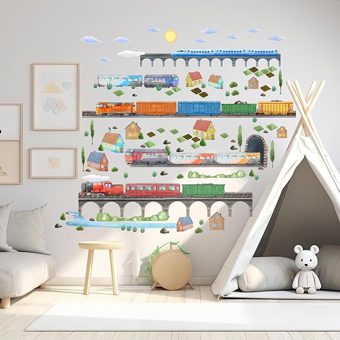 - ๐ Learn and Play. Play is a way to spend fun time with your child, place the stickers on the wall together, and learn the name of each item. Every child is full of curiosity, wall decals for kids are a great tool to explore the world around them. Train wall stickers for boys are good idea for boys bedroom.