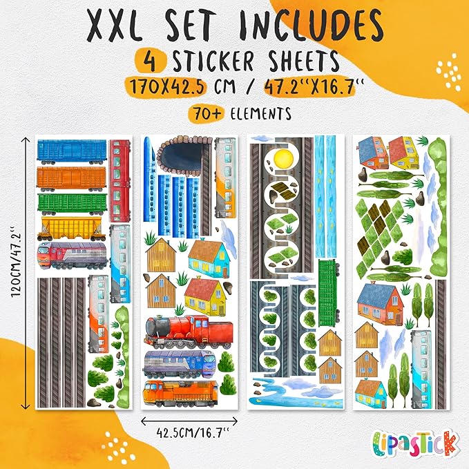 - โญ Instantly bring a boring wall to life with this nursery decor for kids' rooms, featuring a variety of locomotive, tube, carriage, train, bridge and railway stickers. Train wall decals come in a pack of 4 sheets. This set of stickers is size XXL and its size on the wall is 157"" x 98"