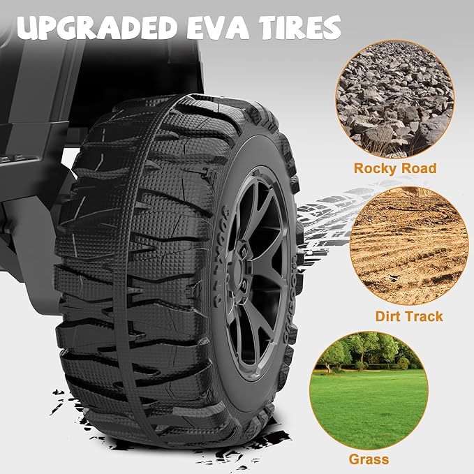 - [Conquer Any Terrain] The ride on car's 4 large-diameter EVA explosion-proof tires offer better traction, wear resistance, anti-slip properties and durability compared to ordinary plastic tires, making this off-road kids ride on toys can conquer most types of roads, such as sidewalks, grass, or gravel. Its excellent suspension system will reduce bumps and vibrations, providing a comfortable ride to the little drivers. Whether playing or exploring, this kids electric car empowers kids to confidently tackle the outdoors, turning every journey into an exciting adventure