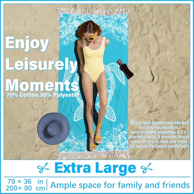 - OVERSIZED AND MULTI:This turkish beach towel blanket including the fringes,offers ample space for various uses.It can be a beach towel,picnic blanket,cozy throw,or poolside cover.Its generous size ensures comfort and versatility,making it perfect for family outings,picnics,or lounging by the pool