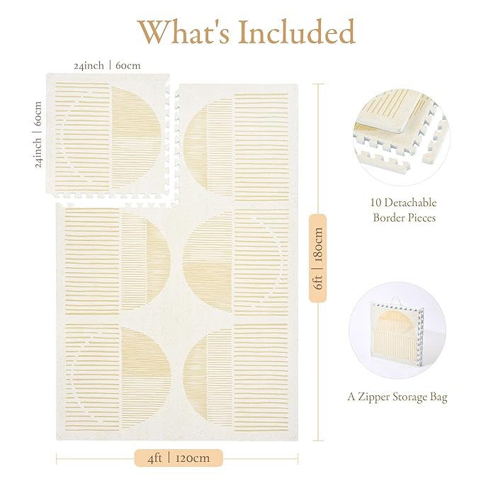 - 【LARGE AND THICKER FOAM PLAY MAT】The PopsyKosy playmat is a large and thick foam mat that comes with 6 interlocking tiles, each measuring 24"x24". The 0.5" thick padding provides a cushioned and safe play area for babies and toddlers, ensuring their comfort and safety during playtime. To maximize both the aesthetics and functionality of your play mat, choose a size configuration that covers the entire room/space.